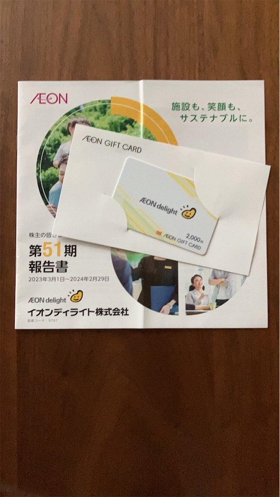 昨日、郵送にてイオンディライト(9787)から優待のイオンで使えるギフトカード2,000円相当が到着しました。イオンディライトさま、ありがとうございます。